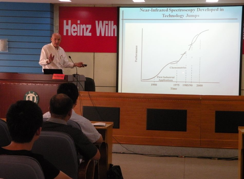 On Jun. 12, Heinz Wilhelm Siesler from University of Duisburg-Essen Visited Jiangsu University. Prof. Heinz Wilhelm Siesler was appointed part-time professor of Jiangsu University. At the ceremony, Chen Long, the vice President, granted prof. Heinz Wilhelm Siesler a letter of appointment, pinned a Jiangsu University emblem for him. After the ceremony, prof. Siesler made a lecture entitled The Near-InFrared Region, A Plea for an Under&#118alued Wavelength Range of Vibrational Spectroscopy.
