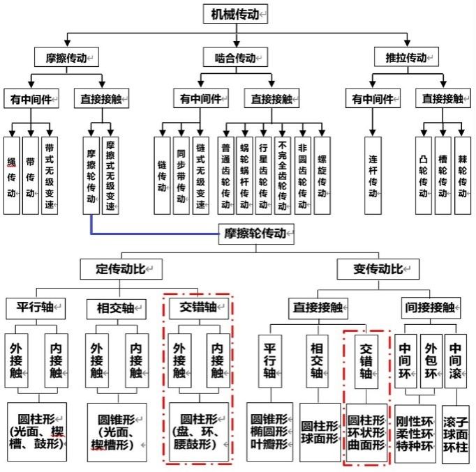 交错轴摩擦轮传动是摩擦轮传动中除平行轴和相交轴之外的第三种传动方式,即两摩擦轮轴线之间既不平行又不相交,属于轴线空间交错的摩擦轮传动。