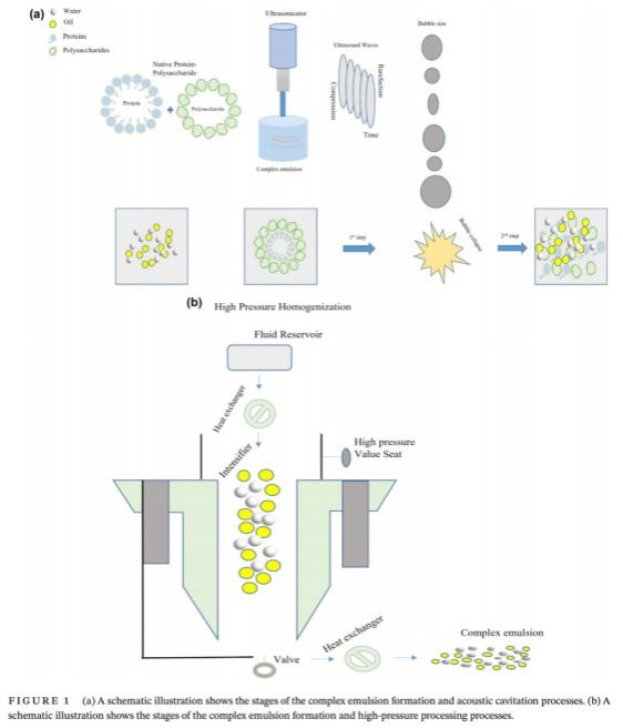 目前乳状液的制备技术,主要采用高强度超声、高压均质、高压微射流、先高速剪切后高压均质等乳化技术,使得乳化剂分子紧密排列在油-水界面,促使两相界面张力降低,制备得到乳状液。与其他技术相比,高强度超声和高压均质具有成本效益高、绿色环保等优点,受到了广泛关注。高强度超声引发的声波空化有助于有效扰乱油滴,从而有效产生稳定的乳化液。高压均质诱导的剪切应力、湍流和空化会导致液滴破坏,从而改变蛋白质结构和食品的功能性。