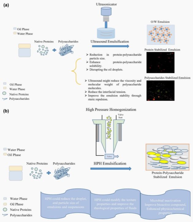 Figure 2 (a) The proposed mechanism for the ultrasound (US) emulsification of protein–polysaccharide-stabilized emulsions is depicted schematically. (b) The proposed mechanism for the high pressure homogenization emulsification of protein–polysaccharide-stabilized emulsions is depicted schematically.