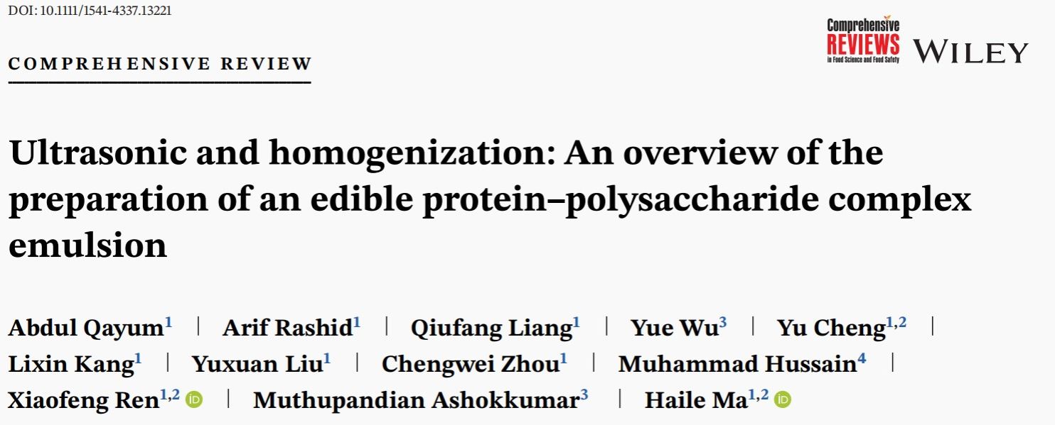 任晓锋教授课题组在国际食品安全和营养领域顶级期刊《Comprehensive Reviews in Food Science and Food Safety》(Q1,IF=14.8)在线发表了的最新研究成果——“Ultrasonic and homogenization: An overview of the preparation of an edible protein–polysaccharide complex emulsion”(DOI: 10.1111/1541-4337.13221)。做爱片