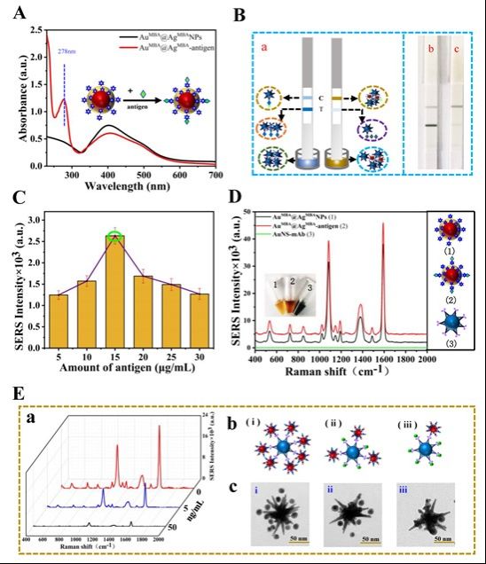论文以ZEN抗原修饰的双层信号分子标记的核壳纳米粒子(AuMBA@AgMBA)作为信号探针(卫星),以ZEN抗体修饰的金纳米星(AuNSs)作为捕获探针(核),通过核-卫星的自组装建立了ZEN的SERS检测方法。该方法中,双层信号分子标记提高了SERS信号的强度和稳定性,多尖端的金纳米星结构提供更多SERS“热点”,形成的组装体可以产生更强的拉曼信号,从而实现了ZEN的高灵敏检测。
