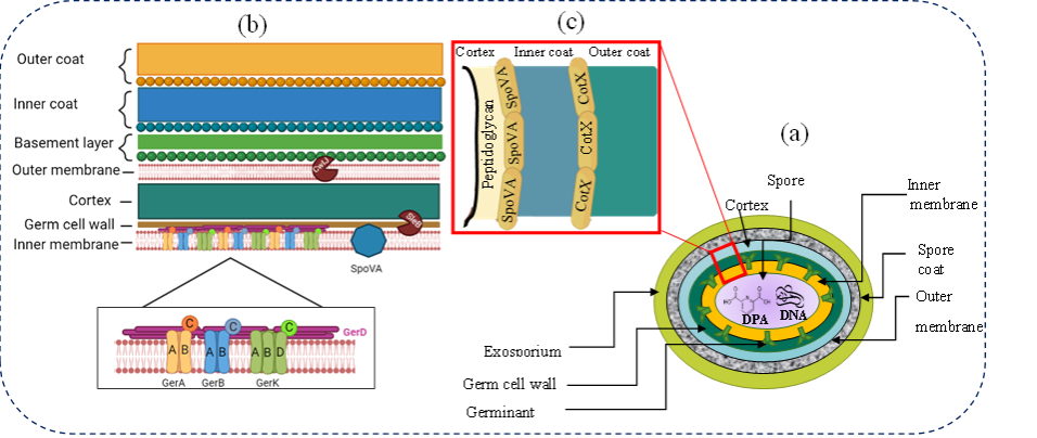 Figure 2 Spore layers (a), germinant receptors localization (b) in spore, and SpoVA Channel localization (c)