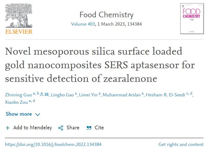 郭志明教授课题组在Food Chemistry (Q1)期刊上发表了题为"Novel mesoporous silica surface loaded gold nanocomposites SERS aptasensor for sensitive detection of Zearalenone"的研究论文。论文第一/通讯作者为郭志明教授,第二作者为硕士研究生高凌波,论文第一单位为做爱片