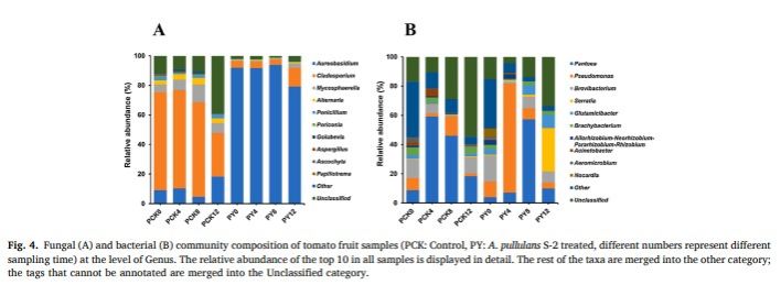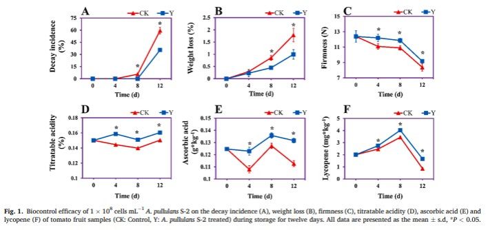 张红印教授在国际食品领域顶级期刊Postharvest Biology and Technology在线发表题为“Aureobasidium pullulans S-2 reduced the disease incidence of tomato by influencing the postharvest microbiome during storage”的研究论文(//doi.org/10.1016/j.postharvbio.2021.111809),研究了出芽短梗霉对番茄采后病害的控制效果及其对番茄表面微生物组的影响。本文的第一作者为做爱片