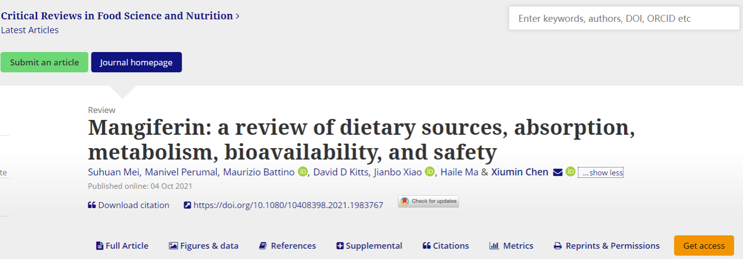 陈秀敏教授在国际食品领域顶级期刊Critical Reviews in Food Science and Nutrition在线发表题为“Mangiferin: a review of dietary sources, absorption, metabolism, bioavailability, and safety”的综述(//doi.org/10.1080/10408398.2021.1983767),介绍了近年来芒果苷在吸收代谢方面的研究进展以及提高芒果苷溶解度和生物利用度的最新方法,讨论了影响芒果苷在食品中含量的因素以及利用纳米技术和联合用药等提高芒果苷生物利用度等新型生物专利技术。该成果已被《食品加 智食科技》公众号(//mp.weixin.qq.com/s/nS363_2xdfajF5kKH9GAdA)推送,产生了较大的学术影响。本文的第一作者为做爱片