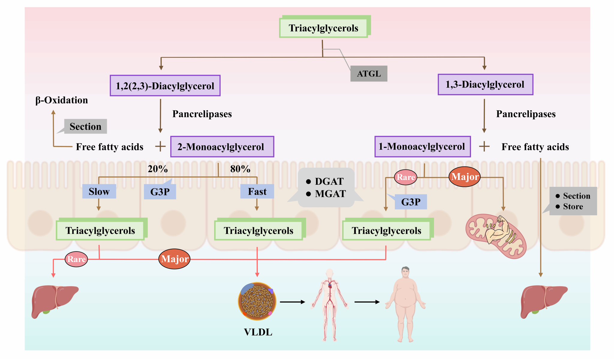 油脂是日常膳食的重要组成部分,甘油三酯(Triacylglycerol, TAG)是油脂的主要成分。膳食TAG首先经过以胰脂肪酶为主的消化酶水解为甘油二酯(Diacylglycerol, DAG),其中1,2/2,3-DAG 作为中间产物被进一步水解,水解产生的2-甘油单酯(2-monoacylglycery,2-MAG)及游离脂肪酸进入小肠上皮细胞,在酰基转移酶作用下酯化重新合成 TAG,并通过淋巴系统进入血液循环运输到肝脏、脂肪等器官中代谢,或储存在脂肪细胞内。当人体过量摄入TAG会导致肥胖、高血压、高血脂和冠心病等代谢疾病。因此,开发和生产具有降血脂和控制体重作用的健康膳食油脂的市场广阔。