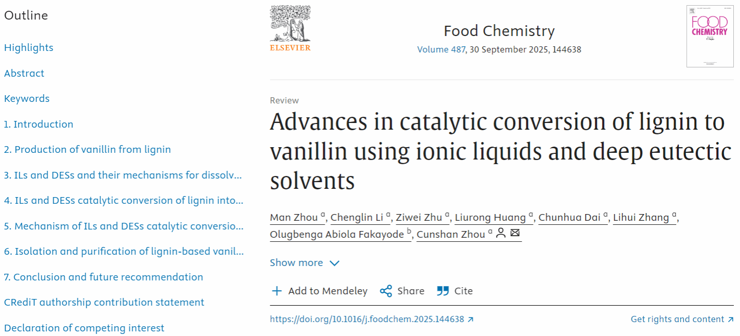周存山教授团队在国际Top期刊Food Chemistry上发表主题为“Advances in catalytic conversion of lignin to vanillin using ionic liquids and deep eutectic solvents”(2025, 487, 144638)的综述文章。做爱片