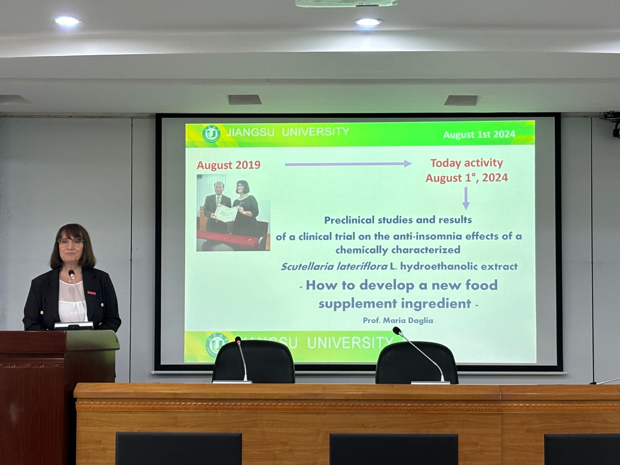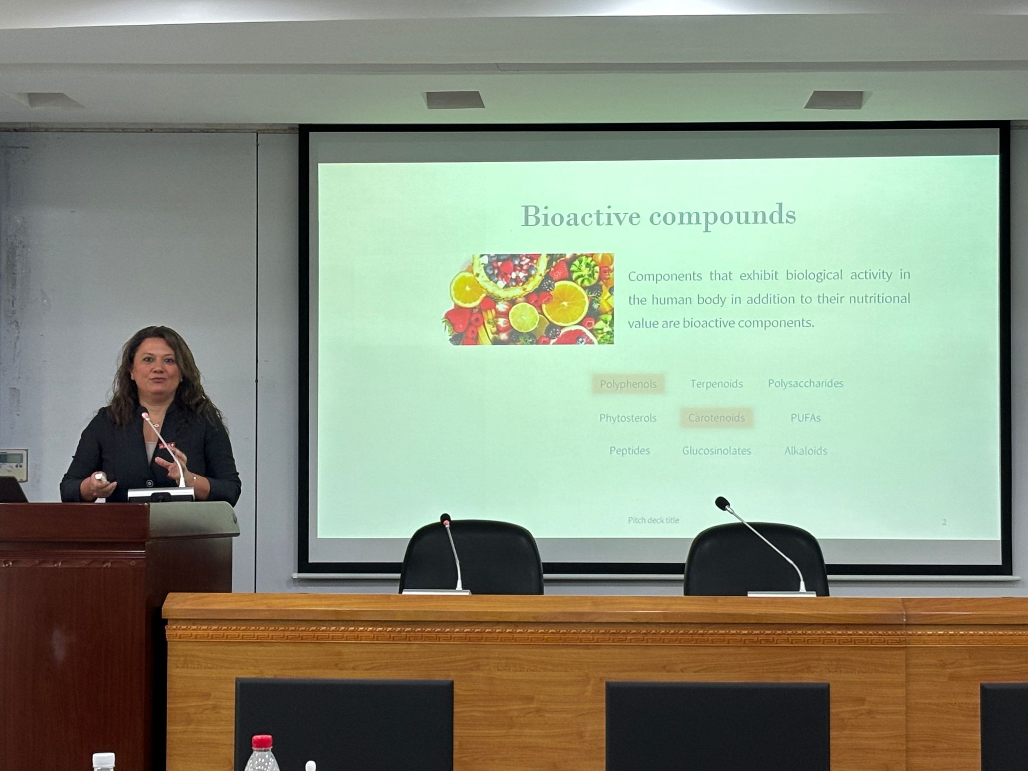 Maurizio Battino 教授主要探讨了膳食中生物活性化合物对乳腺癌的影响;Maria Daglia 教授分享了美黄芩提取物在治疗失眠上的临床研究;Esra Capanoglu 教授重点阐述了采用新技术提高生物活性化合物的含量和生物利用度方面的进展;Francesca Giampieri 副教授主要针对花青素在治疗慢性疾病中的作用研究进行了探讨。国际专家们的报告内容丰富,深入浅出,热情洋溢,引人入胜。报告结束后,各位教授与参会师生进行了气氛热烈的讨论。
