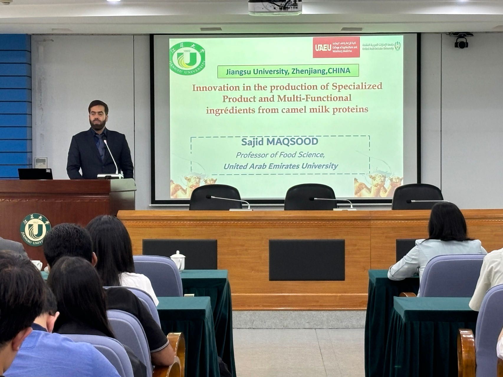 Sajid Maqsood教授首先对阿联酋大学(UAEU)的发展历程、教学质量、科研发展、国际化合作等方面进行了详细介绍。之后,Sajid Maqsood教授重点讲述了益生菌强化骆驼奶方面的研究,并详细探讨了这种新型配方奶在提高蛋白质消化率、抗氧化和抗炎活性、钙离子活性等方面的研究。Sajid Maqsood教授的报告内容丰富,深入浅出,热情洋溢,引人入胜。报告结束后,Sajid Maqsood教授与参会师生进行了气氛热烈的讨论。