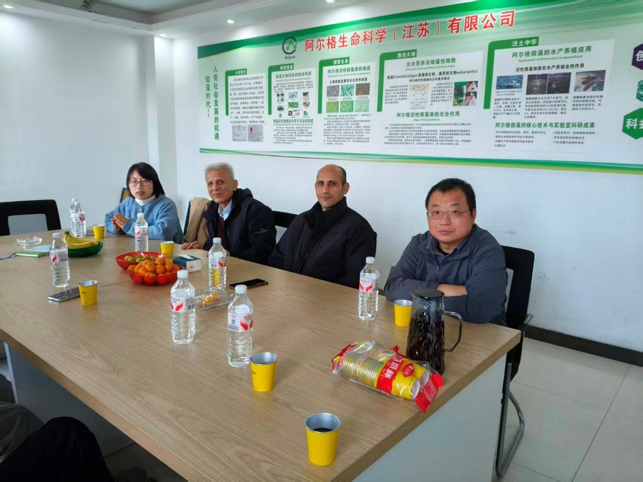 对埃及专家团表示热烈欢迎。霍书豪教授率先介绍项目背景与意义,他指出,盐碱地制约全球农业生产,而稻麦轮作在盐碱环境下产量受限,利用固氮蓝藻絮团调控磷转化、提升轮作效益,是盐碱地治理与农业可持续发展的关键方向。作为国际应用藻类学权威,Mostafa El-Sheekh 教授高度认可项目研究价值,分享了埃及盐碱地治理经验及坦塔大学藻类研究最新成果,强调微藻生长快、适应性强,在盐碱地改良与农业领域潜力巨大。Khalil Saad-Allah 教授则从技术细节出发,为项目研究内容提出建设性意见。双方重点围绕微藻在“工程 - 化学 - 生物”综合改良体系中的作用展开探讨。霍书豪教授团队介绍了固氮蓝藻絮团磷转化调控研究进展,通过筛选高效菌株,证实其可吸收转化土壤磷、提升肥力、促进稻麦生长。Mostafa El-Sheekh 教授团队分享了微藻饲料与肥料开发经验,双方就微藻协同改良机制、规模化生产应用等达成共识,为优化综合改良体系提供支撑。