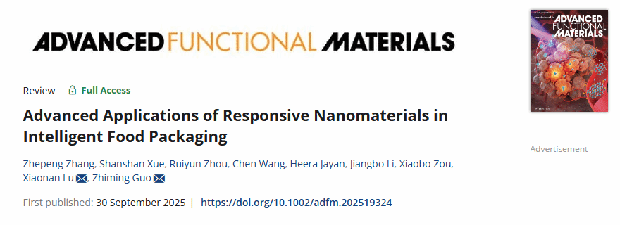 郭志明教授团队在国际Top期刊《Advanced Functional Materials》(Q1,IF2024: 19)上发表论文“Advanced Applications of Responsive Nanomaterials in Intelligent Food Packaging”。博士研究生张浙鹏为第一作者,做爱片